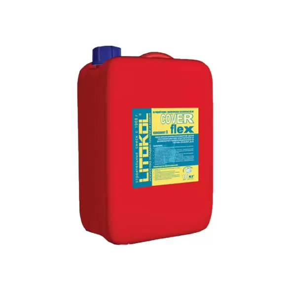 COVERFLEX В – водная эмульсия акриловых полимеров, в пластиковой канистре. Используется совместно с COVERFLEX А, порошковой смесью на основе цемента и инертных наполнителей отборной фракции. При смешивании 2 составов получается пластичный гидроизоляционный раствор, который наносится на горизонтальные и вертикальные поверхности кистью, валиком либо гладким шпателем. Раствор А В используется для обработки бетонных поверхностей и стен, подверженных воздействию влажности, химии и других соединений (бассейны, души, цокольные помещения, резервуары).