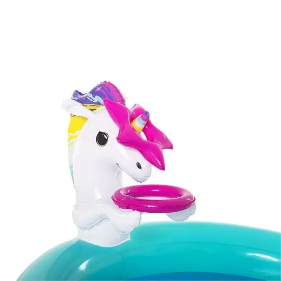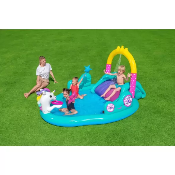Игровой центр Bestway 53097 Волшебный единорог - станет отличным вариантом для летнего детского отдыха. Центр оснащен надувной горкой и разбрызгивателем, в виде извержения лавы вулкана. Для активных игр предусмотрены 4 игровых мячика (для спуска по надувной рампе) и одно надувное кольцо. Большие и широкие стенки из уплотненного винила, состоящие из надувных элементов, обеспечивают комфортное купание с максимальной степенью безопасности.