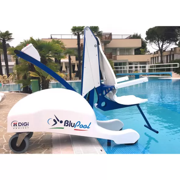 Лифт-подъемник для инвалидов Blupool позволяет плавно и безопасно перемещает людей из раздевалки в бассейн и обратно, а также в другие места у воды. Лифт прост в использовании. Человек садится на сиденье спереди и перемещается к краю бассейна. У края бассейна достаточно нажать кнопку «вниз», и пловец медленно погрузится в воду. Чтобы поднять сиденье, просто нажмите кнопку «вверх». Операция завершена, как только сиденье вернется в исходное положение.