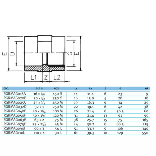 Муфта переходная ВР EFFAST d90x3" RGRMAG090I из непластифицированного поливинилхлорида PVC-U. Пр-во Италия. Изделия из ПВХ оптимальны для транспортировки жидкостей от 1 до 60°C под давлением и могут использоваться в системах водоснабжения и водоподготовки.
