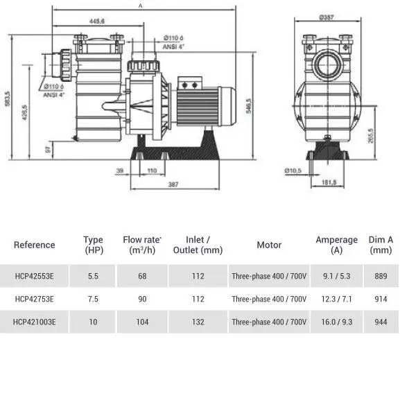 Самовсасывающий центробежный насос HCP42753E c префильтром для коммерческих бассейнов. Используется для фильтрации и циркуляции воды. Линейка HCP была разработана компанией Hayward как надежная альтернатива тяжелым чугунным и бронзовым насосам для коммерческого применения. Изготовлены из легкого прочного термопластика, обогащенного стекловолокном. Гидравлические узлы из Noryl позволяют использовать насосы с соленой и морской водой. Оснащен префильтром большой емкости. Прозрачная крышка префильтра на 4-х легкооткидных винтах из нержавейки. В насосе используется высокомощный охлаждаемый мотор TEFC отвечающий стандарту экономии энергии IE3 (сверхвысокий класс энергоэффективности). Модель 400/700В с 4-полюсным движком на 1450 об/мин. Рекомендован для использования в бассейнах объемом до 360000 литров.