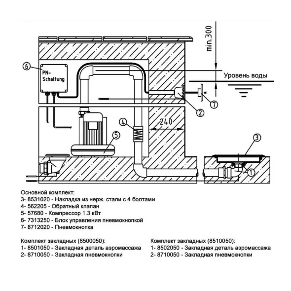 Насосный комплект аэромассажа Fitstar 1,1 кВт 8530020 для круглого воздушного гейзера FitStar. Подходит к плиточным или пленочным бассейнам. Включает в себя компрессор, обратный клапан, аэромассажное плато из нержавеющей стали AISI-316L, пневмокнопку, пневмоблок.