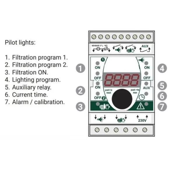 Светодиодные индикаторы: насос, тревога, фильтрационные программы, вспомогательный выход, текущее время