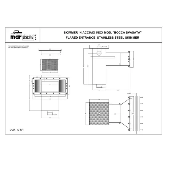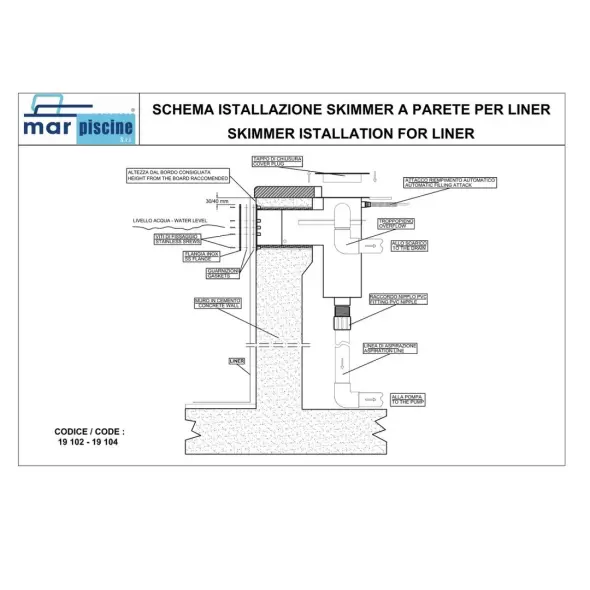 Скиммер под лайнер Marpiscine 19104 класса Premium. Широкое горло. Имеет корзину из нержавеющей стали. Закладные Marpiscine отличаются эстетическим видом и повышенной надежностью, срок службы таких деталей достигает десятков лет.