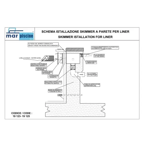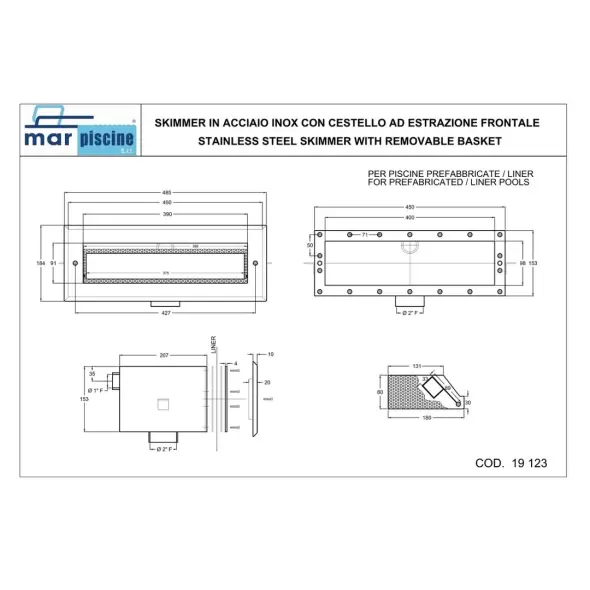Скиммер Marpiscine 19123 класса Premium. Узкое горло. Имеет фронтальную корзину из нержавеющей стали. Закладные Marpiscine отличаются эстетическим видом и повышенной надежностью, срок службы таких деталей достигает десятков лет. Горловина 400 мм.